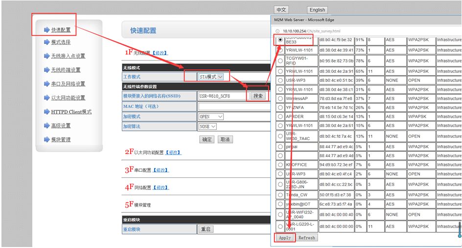 (1)点击快速配置,选择STA工作模式,点击搜索,搜索路由器,选择要连接的路由器