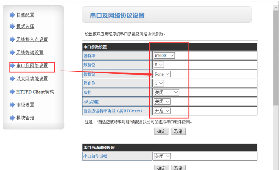3、点击串口及网络设置,相应设置如下:(波特率可根据自己需要设置) 点击确定