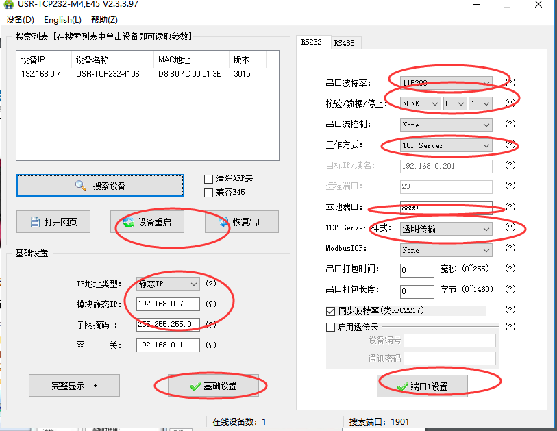 1. 设置410S (第一台)的参数:打开设置软件USR-TCP232-M4-setup-V2.3.3.97,设置他的工作方式为TCP sever,设置本地端口号为8899. 然后点击“端口1设置”,再点击“设备重启”。如图所示: