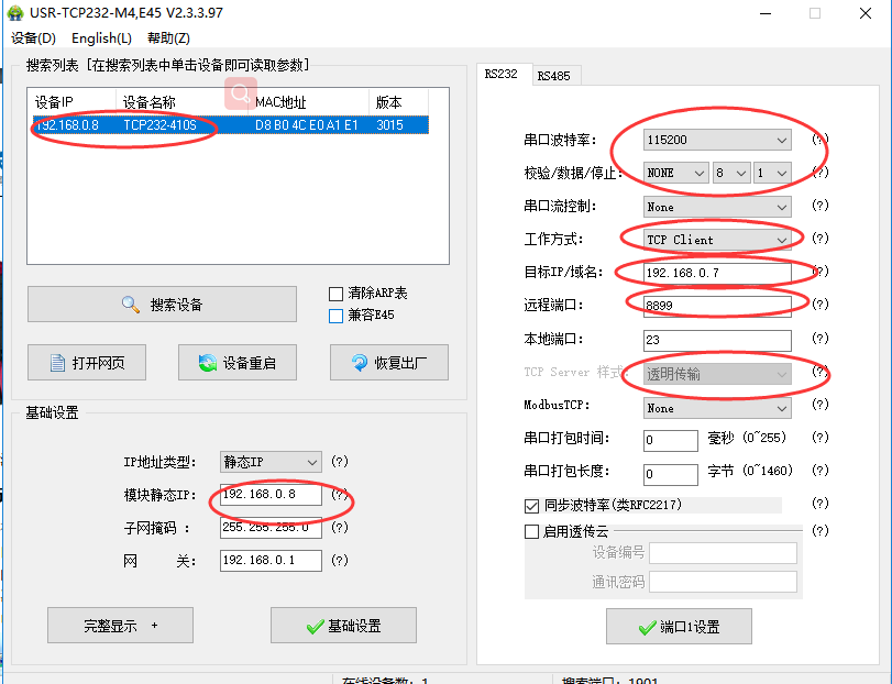 2. 设置410S (第二台)的参数:打开设置软件USR-TCP232-M4-setup-V2.3.3.97,设置他的工作方式为TCP clinet,设置他的“目标IP/域名”为:192.168.0.7,设置远程端口号为8899,然后点击“端口1设置”,点击“基础设置”再点击“设备重启”。如图所示: