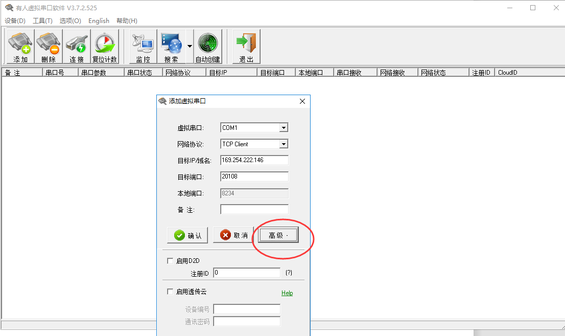 1. 手动添加虚拟串口按键,他可以根据模块的配置信息手动添加虚拟串口,如果是需要将虚拟串口软件链接到透传云,要通过这个高级设置启用透传云,然后将设备和透传云建立链接。