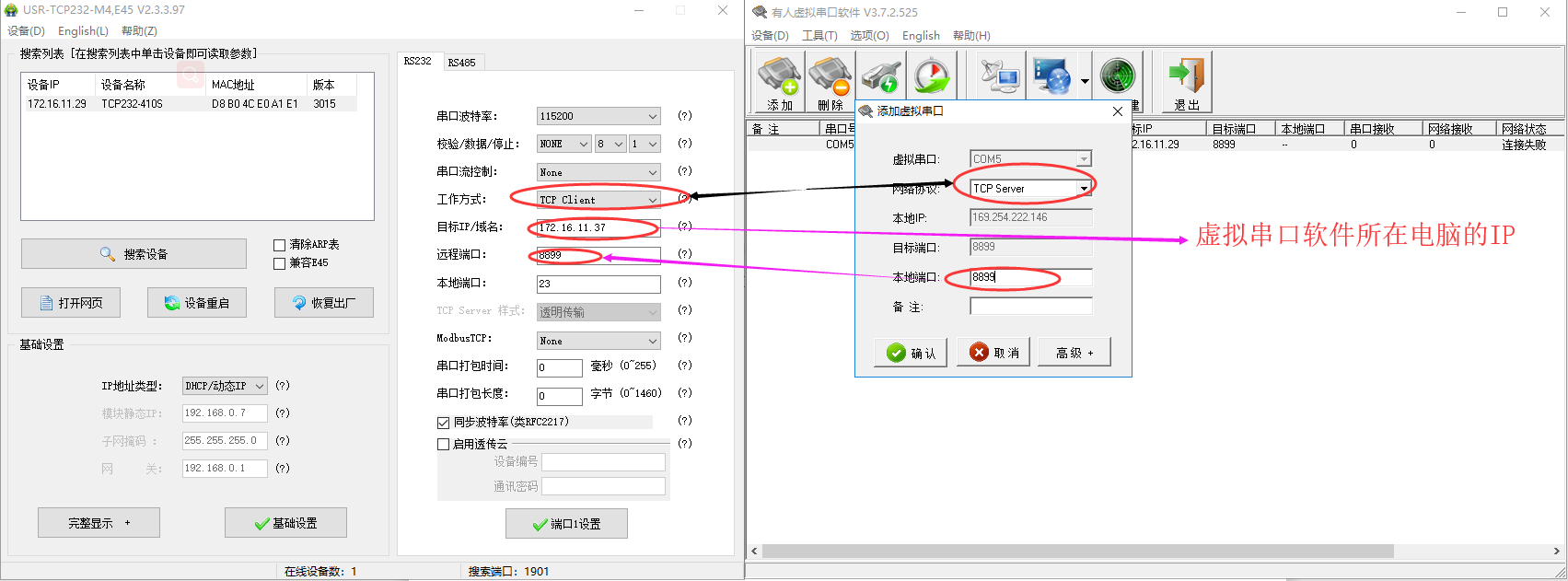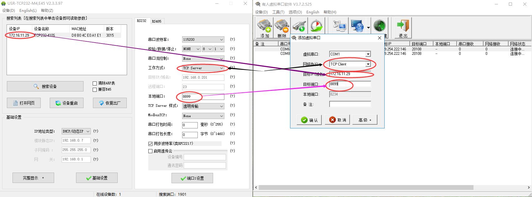 虚拟串口软件和设备之间的工作方式,一端作client一端作sever。