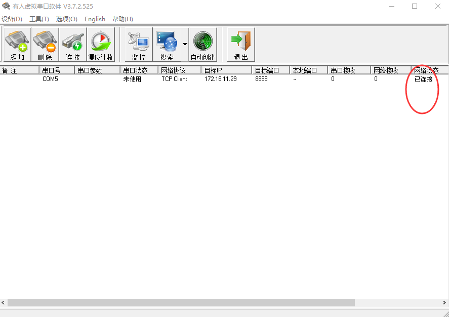 设备本身有一个IP,这个IP在设置软件中搜索设备时显示出来,当设备做sever的时候只需要设置他的本地端口,虚拟串口作为客户端(client)去主动链接作为服务端(sever)的设备,此时要将服务器的IP地址和服务器的本地端口分别给虚拟串口的‘目标IP/域名’和‘目标端口’。点击确定,虚拟串口软件显示如下图所示,“已连接”说明虚拟串口和设备建立通讯成功。