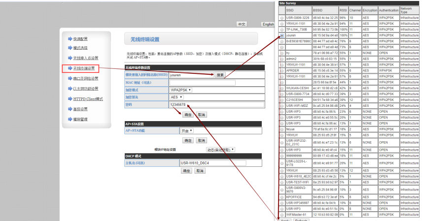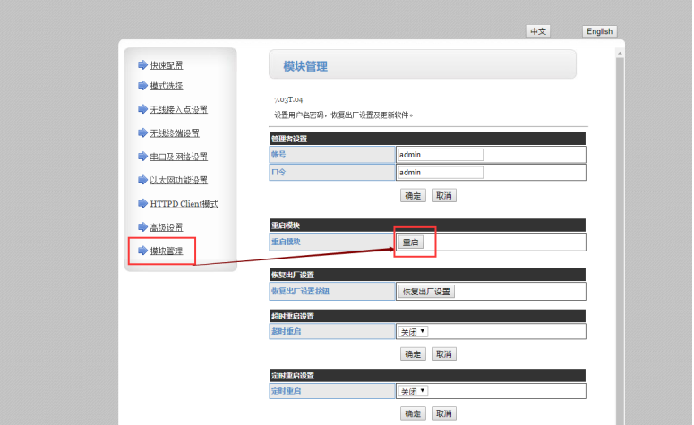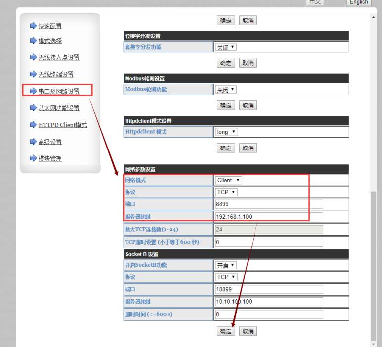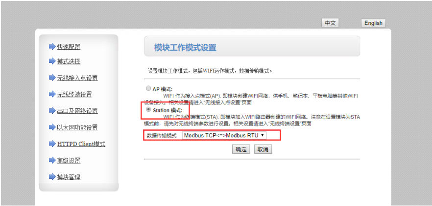 1、模式选择,选择STA工作模式,选择数据传输模式为modbus rtu <=>modbus tcp,