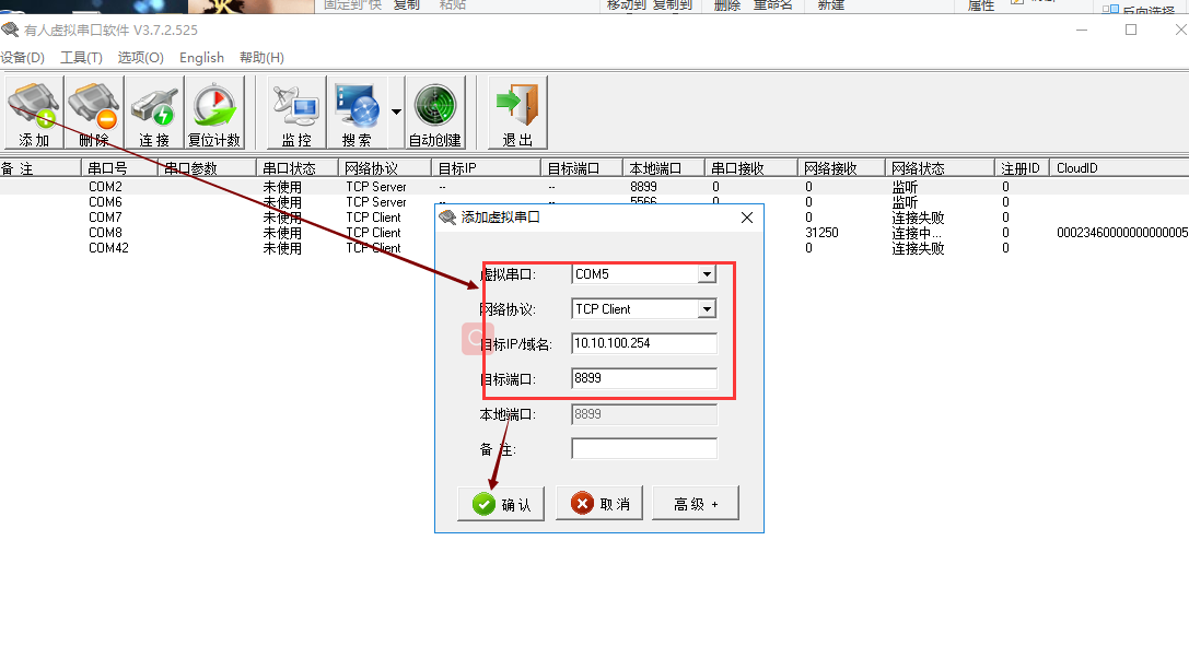 1>添加虚拟串口,网络协议TCP client,服务器IP地址10.10.100.254,服务器端口号8899,确认