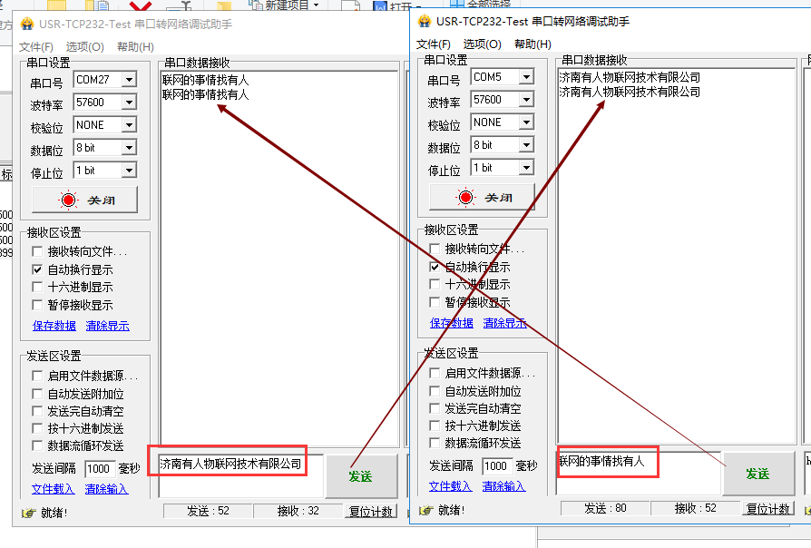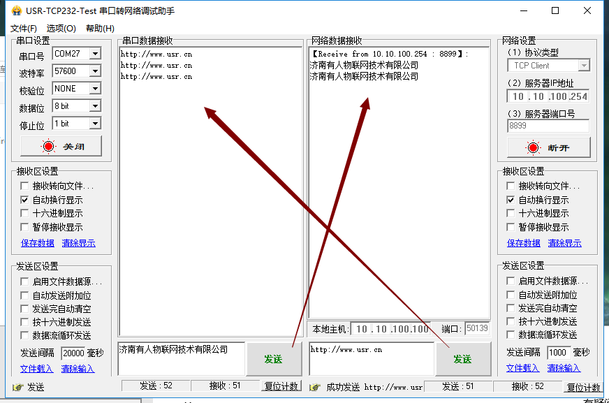 从下图可以看出,串口和网络端可以正常的双向数据收发