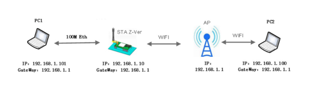 USR-W610模块(以下简称W610)通过Wi-Fi接到AP上,PC1通过以太网接到W610模块上,这时W610模块相当于一个透明的设备,PC1和PC2在同一个局域网,相互通讯不受任何限制,如果AP可以联网,那么PC1也是可以上网的。下面介绍如何设置A2模块,才能实现这种功能。