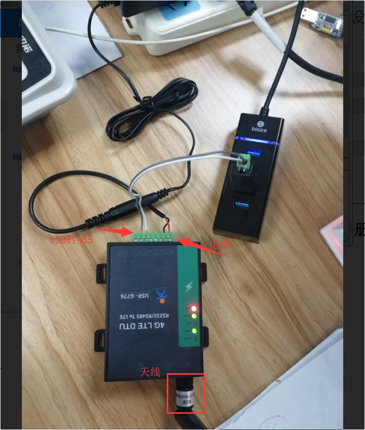 (1) 硬件连接:装上sim卡,接上天线,G776的串口通过UAB转RS232/485接到PC上,用我司提供的适配器供电。带白条的那根线是正极,带字母的那根线是负极。注意G776的RS232和RS485不能同时发送数据,设置的时候只接一个串口就可以了
