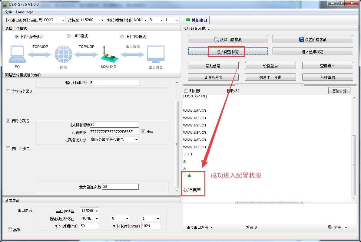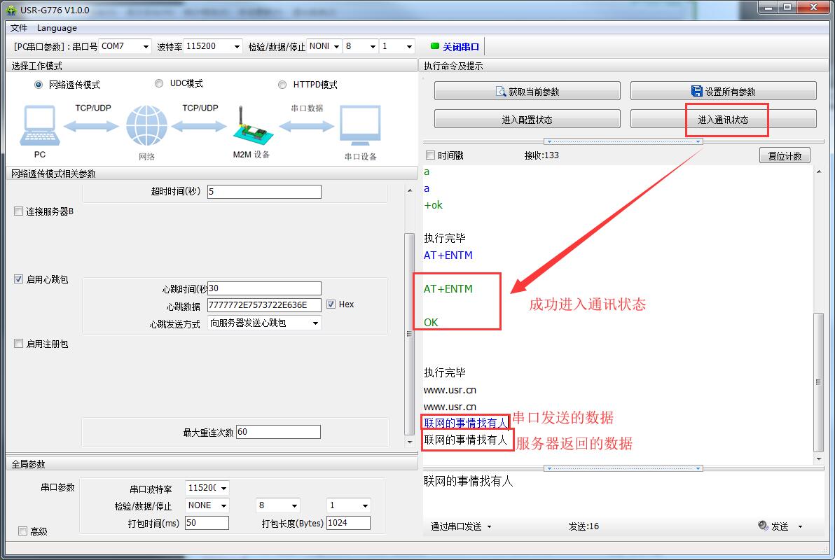 A:1>进入配置状态后:模块只能识别AT指令(注意AT指令最后一定要加回车换行),不能进行数据收发的;如果发送数据的话,模块就会报错或者数据无法发送成功,这时候需要先进入通讯状态(成功现象见上面第5步的图片),然后在发送数据(总有客户在配置状态下,发送数据导致发送数据失败或者模块报错)