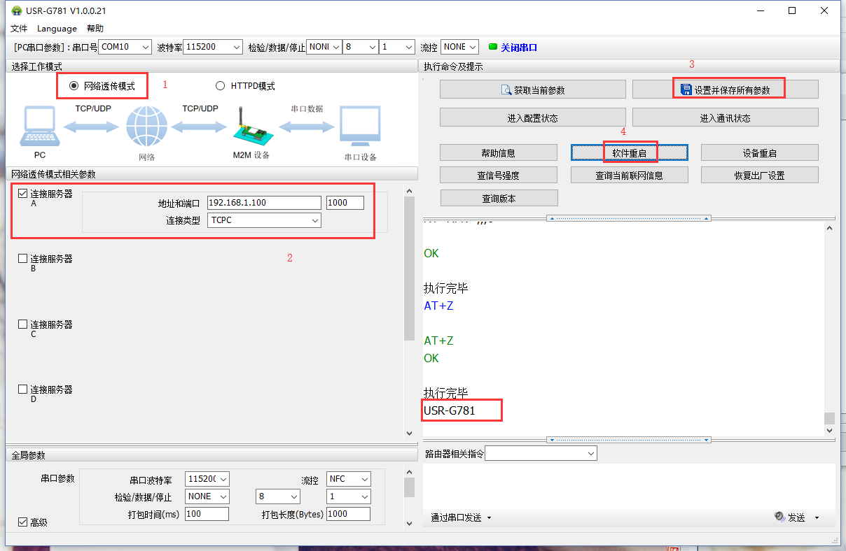 (6)设置参数。设置工作模式为“网络透传模式”,勾选链接服务器A,填写PC的IP和监听端口,链接类型选择TCPC,即TCP Client。设置完参数点击“设置并保存所有参数”,执行完毕后,点击软件重启,待串口打印启动信息,如“USR-G781”,代表设备重启完毕。
