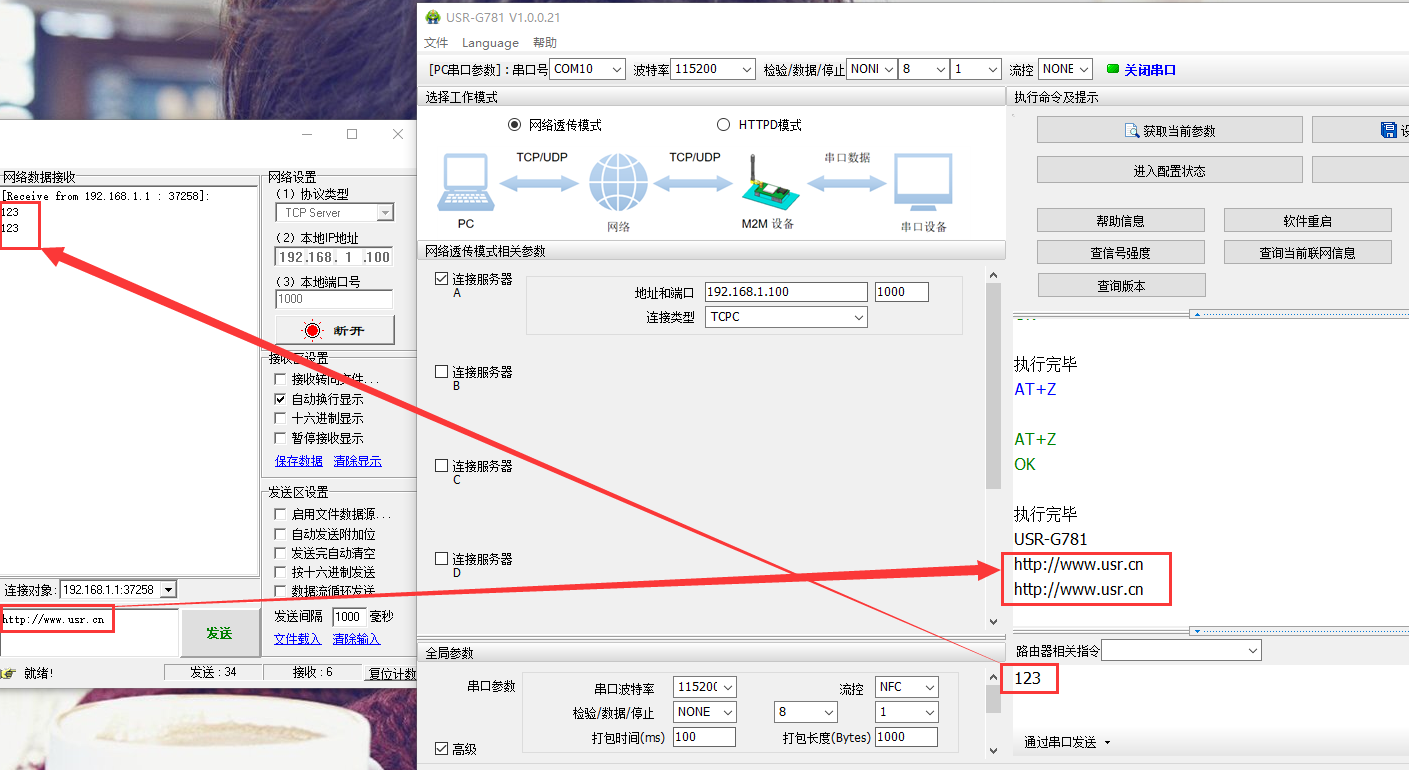 (2)数据通信。打开G781设置软件或者打开对应的串口调试助手,如下所示,可以实现双向数据通信,即表示OK
