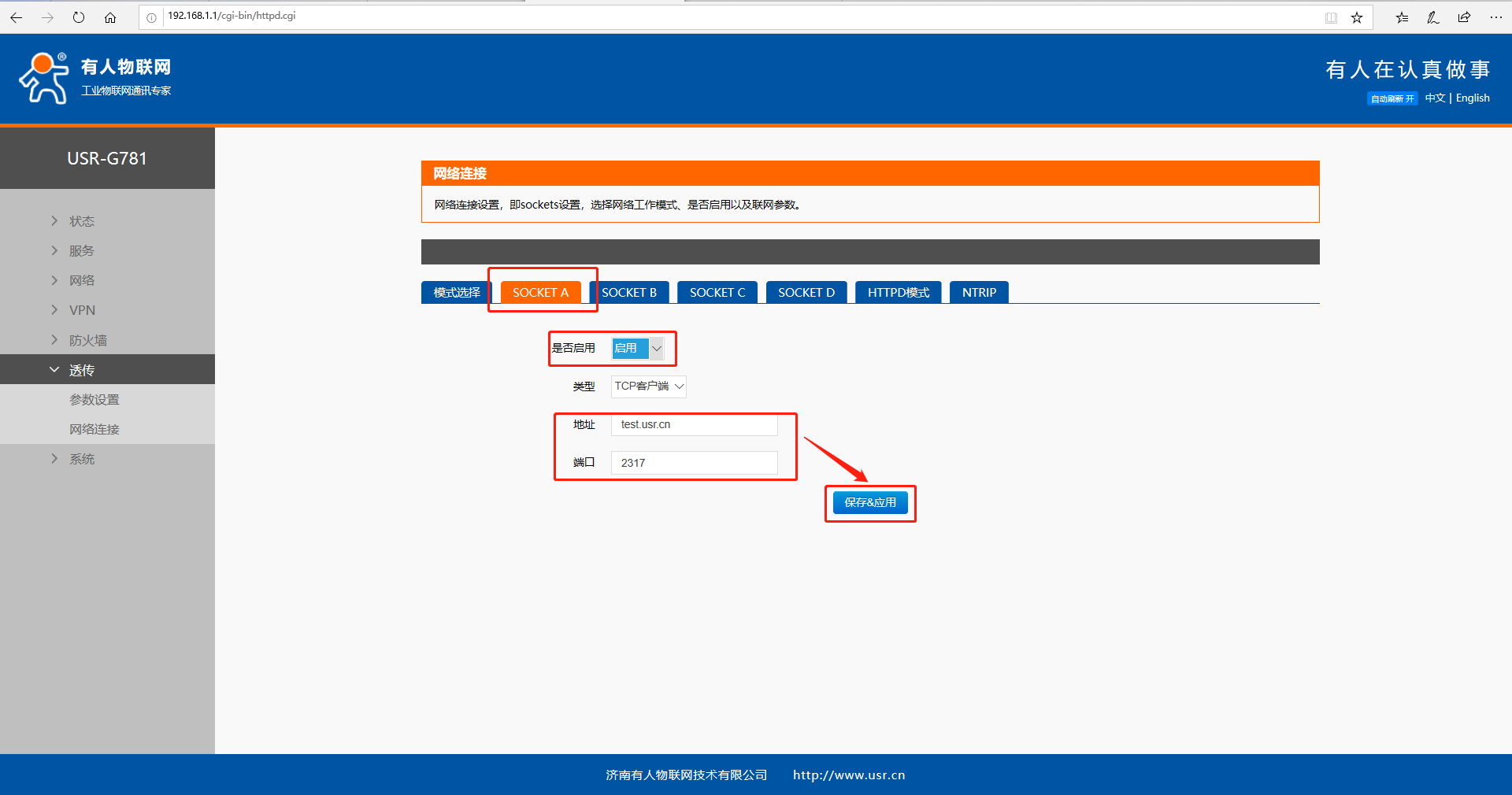 选择SOCKETA,启用,设置地址和端口为192.168.1.100:1000,保存并应用