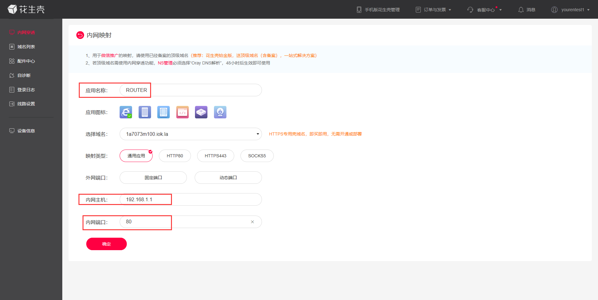 5、应用名称可以自定义,以便于自己区分。应用图标、应用域名、映射类型、外网端口可以根据自己需求来选择,有些选项是收费的。(具体收费细则可咨询花生壳的相关销售和技术,本功能是第三方应用,我司不对其进行收费等业务办理。)在这里如下设置。内网主机填写路由器的LAN口IP地址,端口是80(路由器的内置网页固定端口,不可修改).设置完成后点击确定。