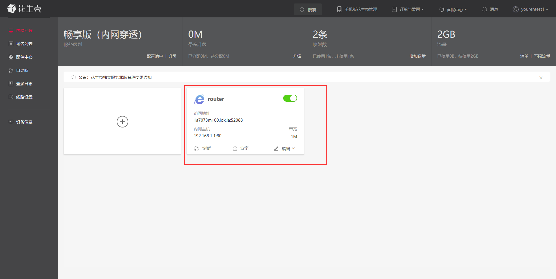 4、左侧导航栏点击进入花生壳内网穿透,点击页面上的+,进入配置。(默认免费版本一个账号可以免费设置两个内网穿透。)