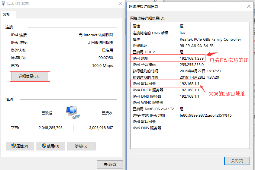 2、双击该网卡,显示详细信息,查看电脑获取的IP