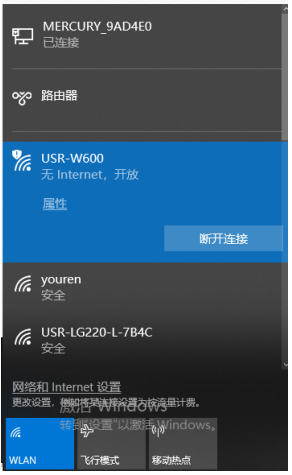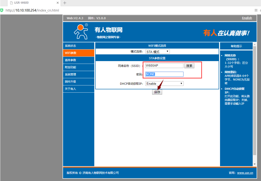 a. 给模块上电,待模块READY灯亮后,电脑无线网络加入(w600).打开网页,登录10.10.100.254.账号和密码都是admin;