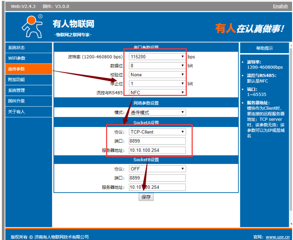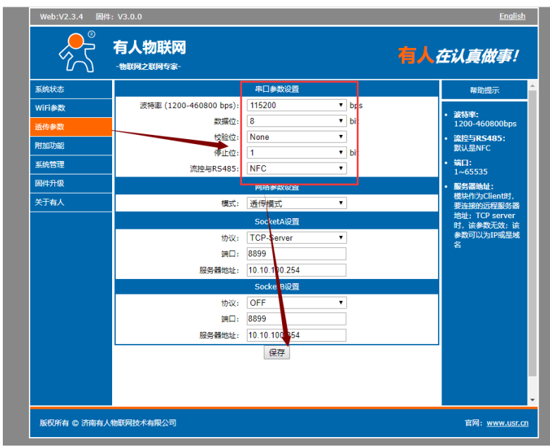 c. 进入串口及网络设置页面 ,修改波特率等同AP模块一致。修改完成后点击 确认 保存设置。将网络参数设置中的SERVER改成CLIENT,服务器地址改为:10.10.100.254(AP设备的IP地址).