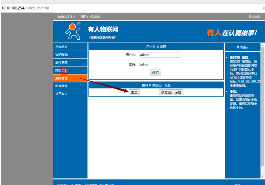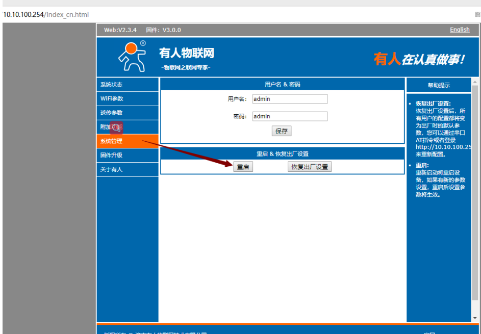 d. 进入系统管理界面点击 “重启” 重启模块使改动生效。此时对AP模块的设置完成。