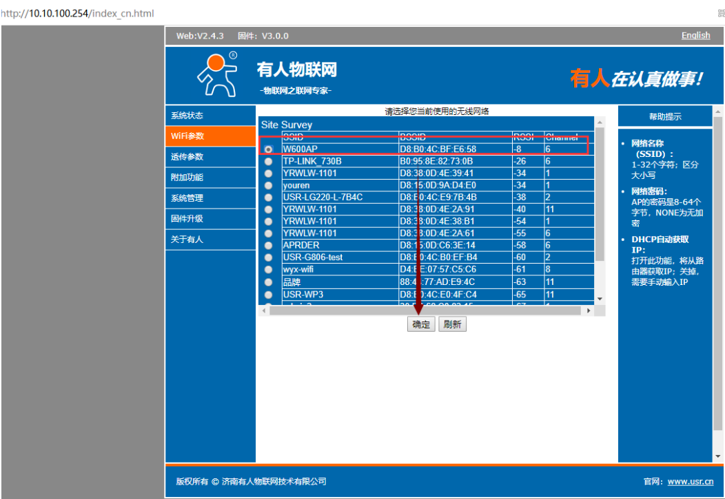 选择搜索到的AP模块信号(W600AP)。点击确定(不要马上重启模块,所有设置完成后再重启)