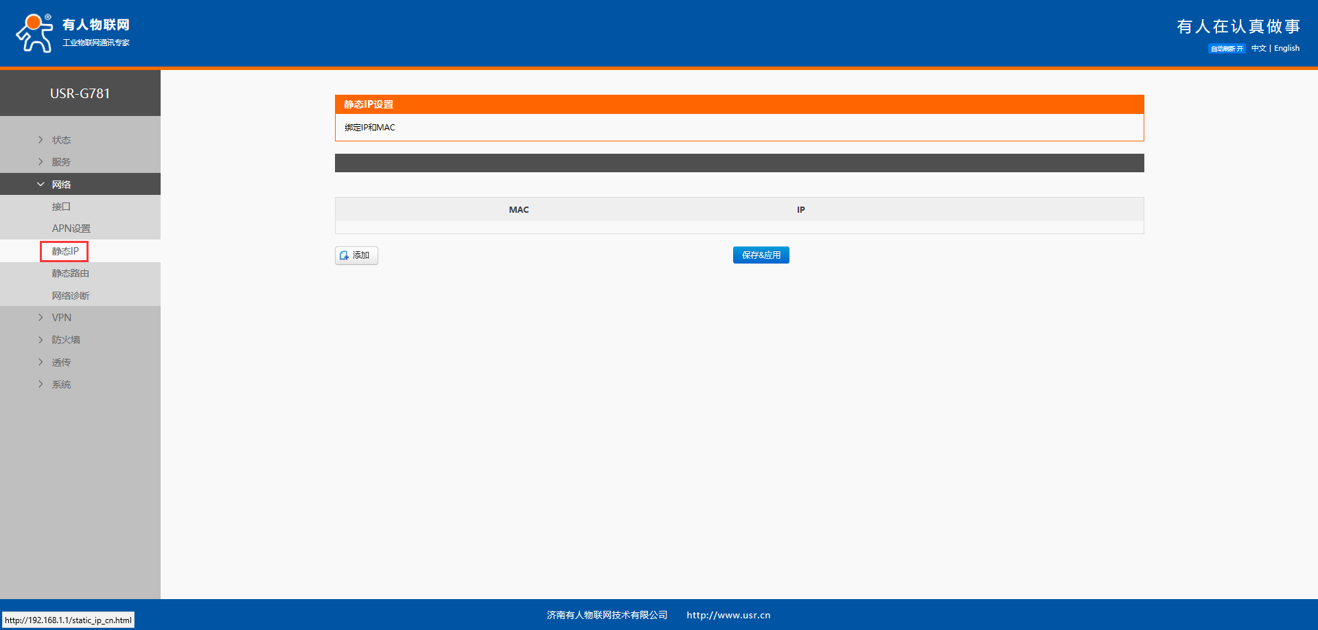 1、 进入G781的设置网页,进入网络------静态IP设置界面,如下图所示。在该界面可以设置MAC和IP绑定,从而让设备能够以固定IP接入路由器: