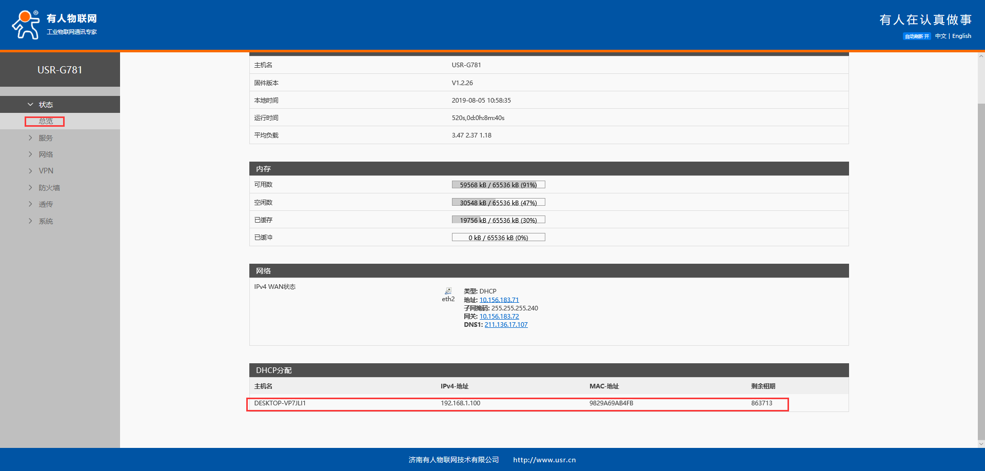 注意:若不知道设备MAC,且之前设备是DHCP接入G781,可以在状态总览界面的DHCP分配看到设备的接入信息。