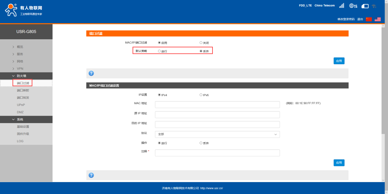 2、防火墙---端口过滤,MAC/IP/端口过滤选择“启用”,默认策略选择“丢弃”。点击“应用”。