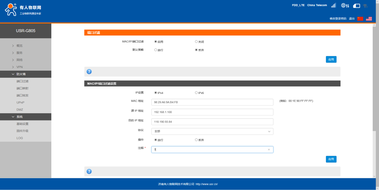 填写PC的MAC、IP,目的IP填写G805的LAN口IP,协议选择全部,操作选择“放行”。设置完成后点击应用。
