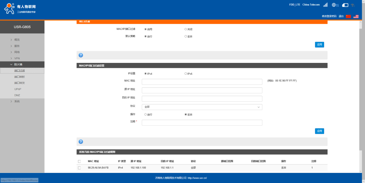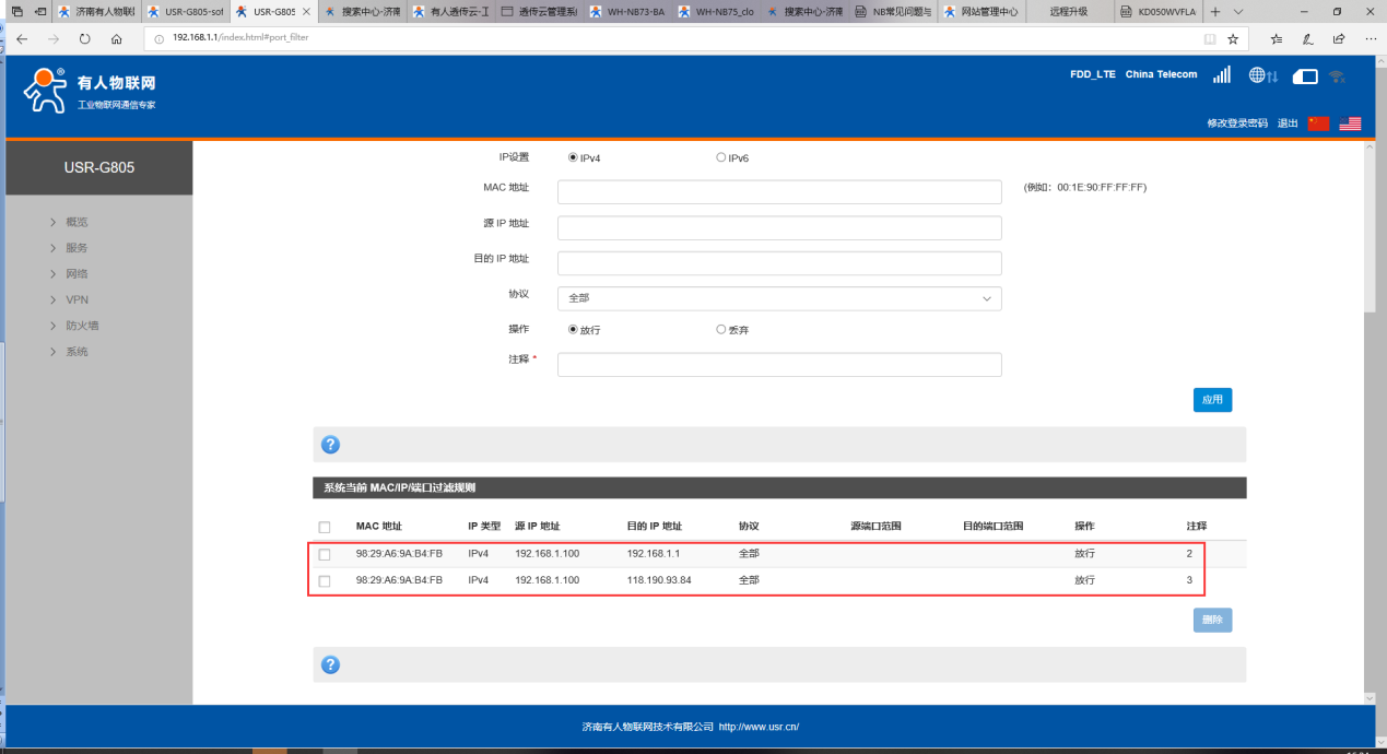 USR-G805 端口过滤基本测试