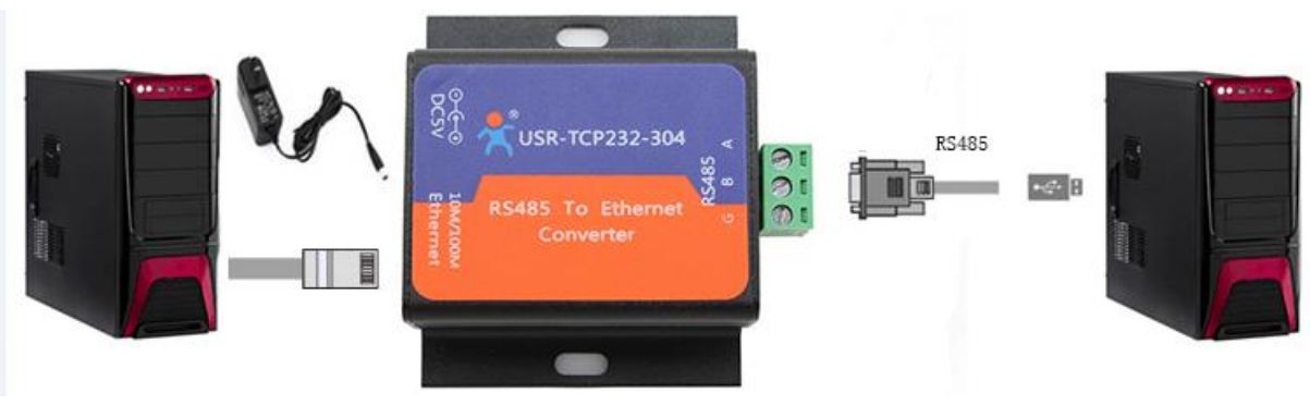 将304接入标准得适配器电源,将304得网口和电脑得网口链接起来,通过USB转485串口线链接到电脑上。如图所示: