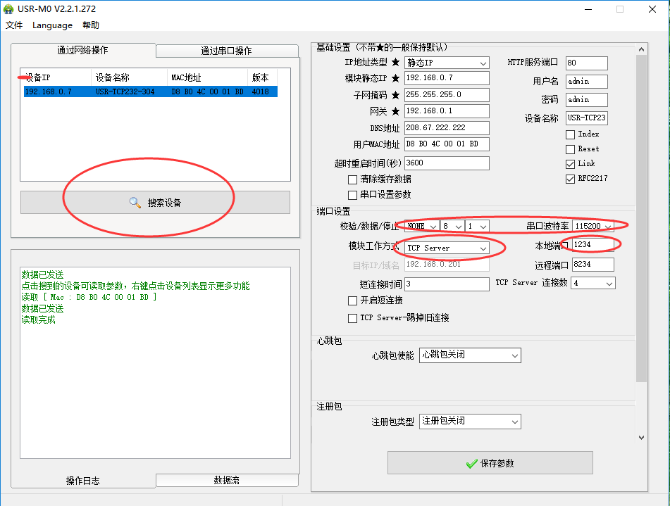2. 打开设置软件:USR-M0_V2.2.1.272,点击“搜索设备”,搜索到设备后选中设备,修改304得参数,串口参数测试时可以默认(如果需做改动,可以直接修改),设置“模块工作方式”为“TCP Sever”,“本地端口”设置为“1234”,然后点击“保存参数”。
