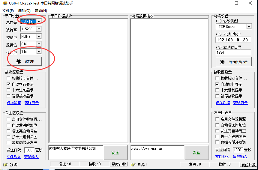 3. 打开测试软件:USR-TCP232-Test-V1.3,选择相应com口(我得电脑右击->属性->设备管理器,com口中可以看到),然后将串口得设置和设备得串口参数一一对应,对应好打开com口。如图所示: