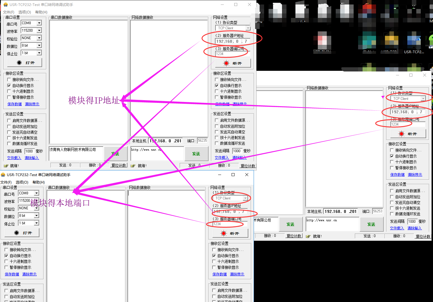 4. 打开3个测试软件:USR-TCP232-Test-V1.3,分别与我们得模块建立socket链接,如图所示: