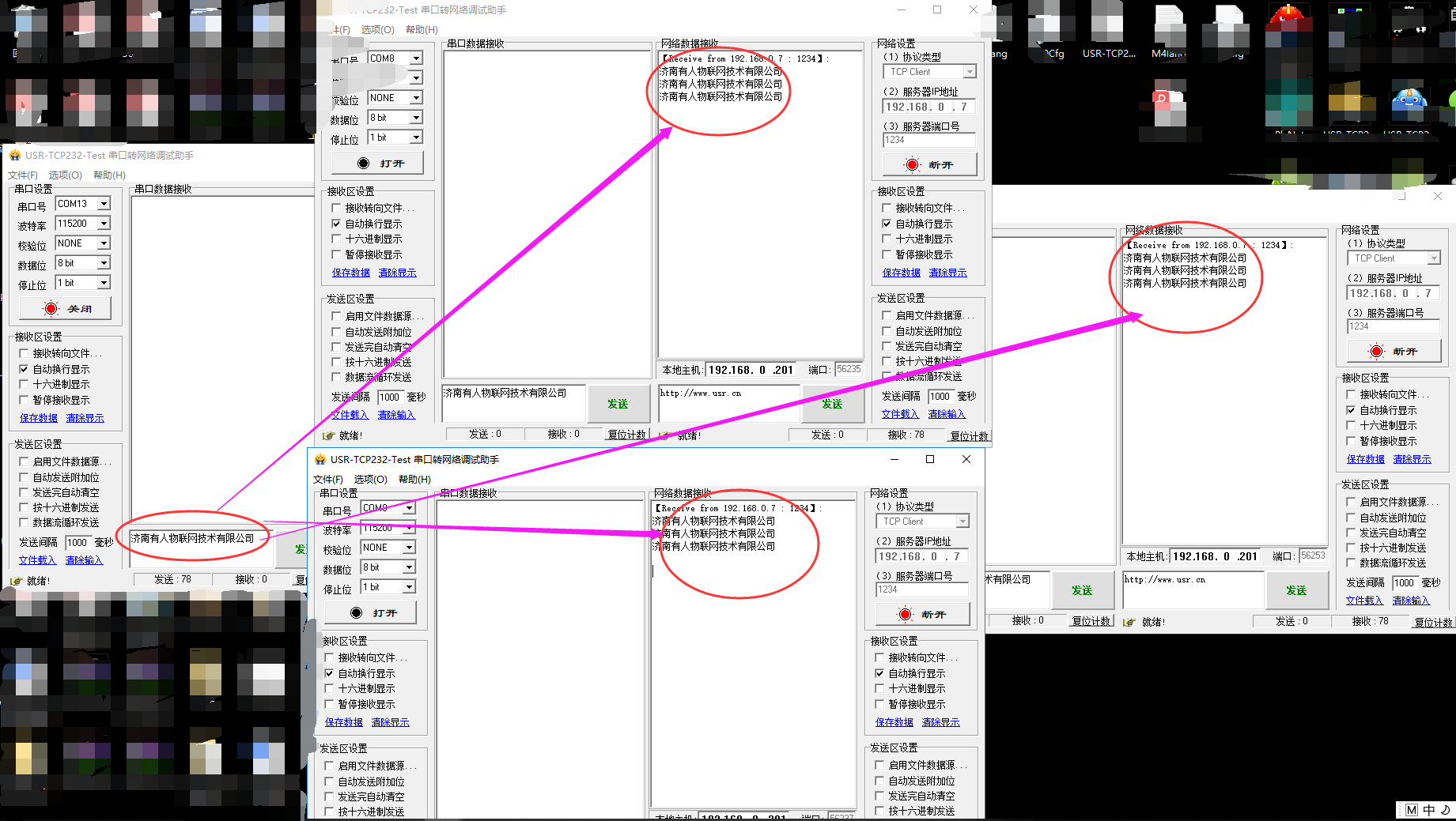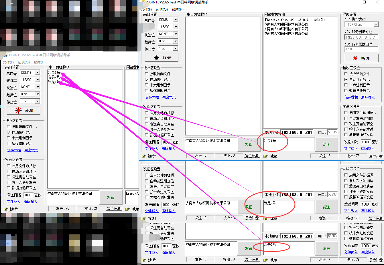 5. 从COM口发送数据,三个测试软件(可以理解为3台电脑都可以收到数据)