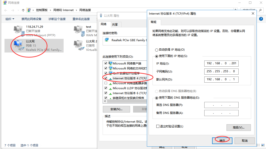 1. 设置电脑的IP为静态IP:192.168.0.201(保持再同一个网段)