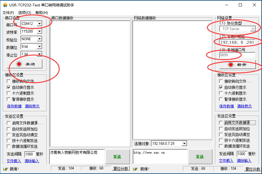 3. 打开测试软件:USR-TCP232-Test-V1.3,串口号可以在设备管理器中查询,然后本地端口可以写成“192.168.0.201”端口号是“8899”点击打开和监听按钮。相互发送数据。