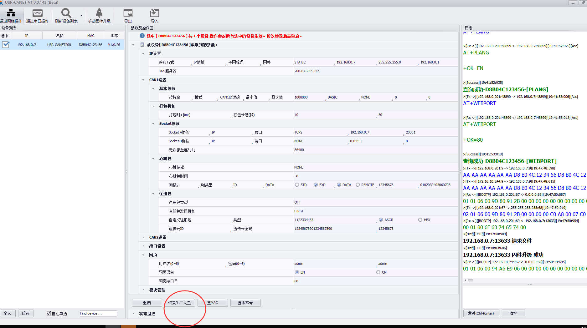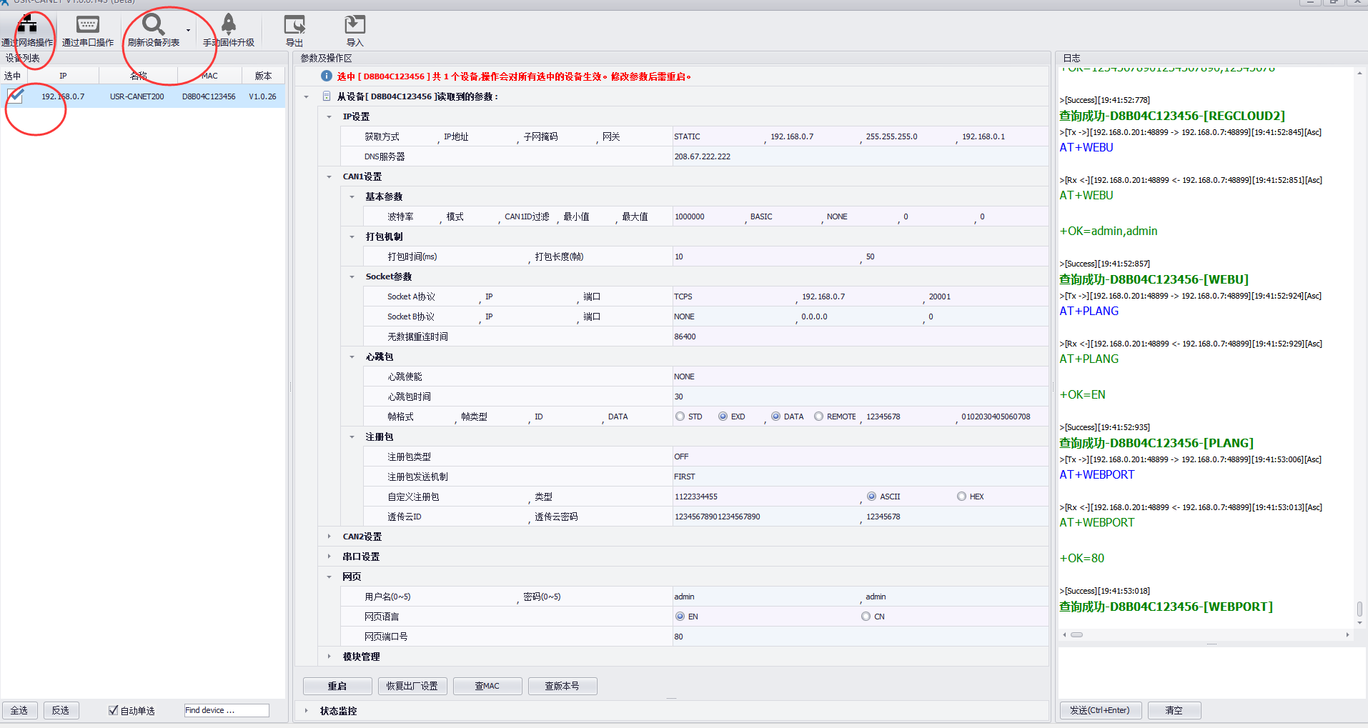 2.打开设置软件:USR-CANET V1.0.0.143 (Beta),点击通过“网络操作”,然后点击“刷新设备列表”,搜索到设备之后,勾选到相关的设备。设备的参数会刷新。