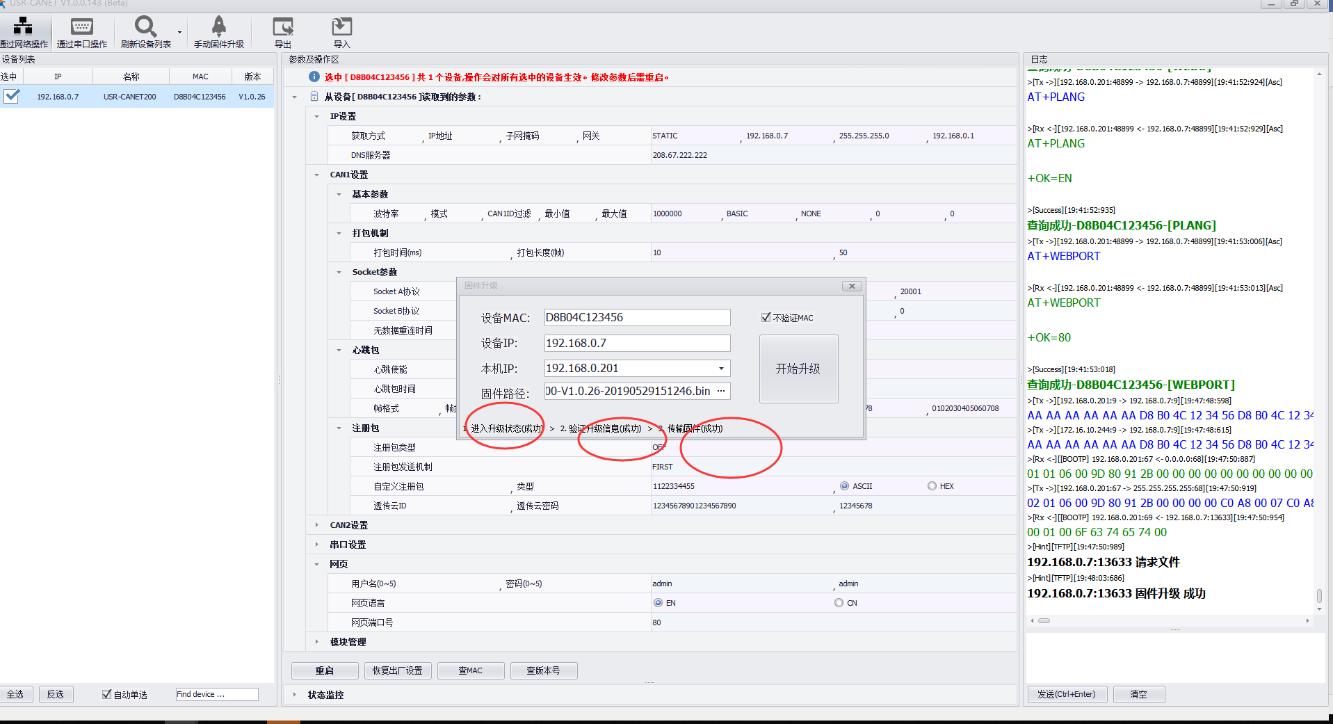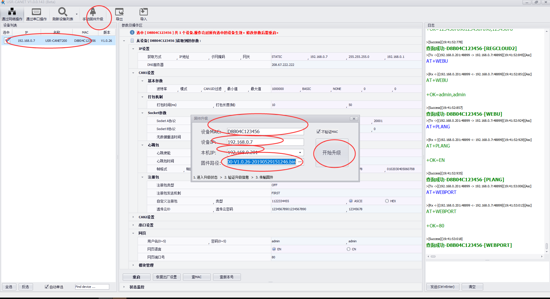 USR-CANET200、标准电源适配器、所要升级的固件(可提工单获取最新固件)、USR-CANET V1.0.0.143 (Beta)(设置软件,用来固件升级的工具)。