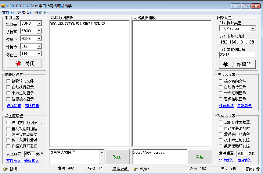 确认之后连接上。在手机端发送www.usr.cn。电脑端口串口接收能够收到数据。