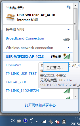 1:模块默认为AP模式下,在电脑上搜索HF-A11xAP的SSID。电脑连接上模块的SSID。