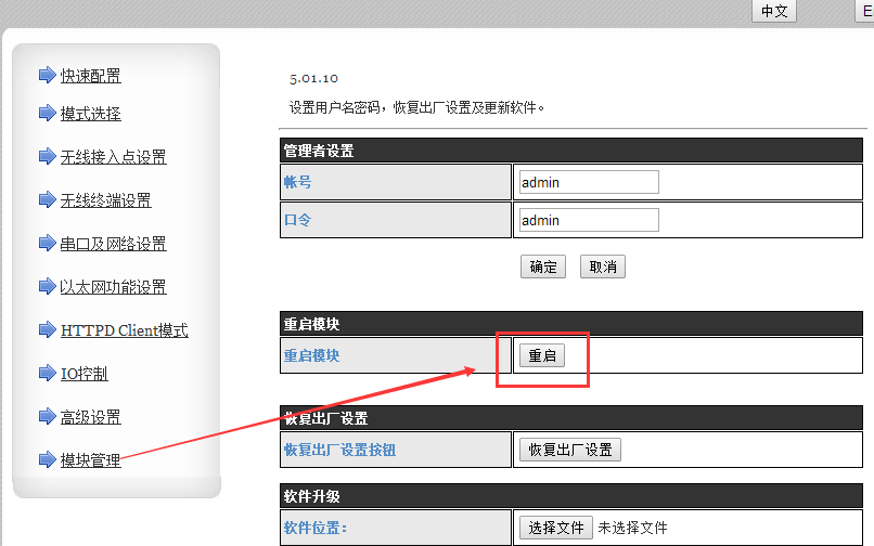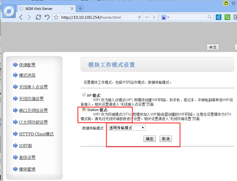 2:在电脑浏览器上输入10.10.100.254.用户名和密码都是默认admin。进入设置界面,在模块工作模式设置里,设置模块的工作模式为station模式,点击确认。
