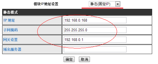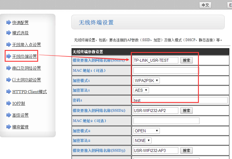 3:设置模块连入无线路由器。在无线终端设置中,搜索要连的路由器的SSID ,确认后,输入无线密码,点击确认。模块IP地址设置为静态IP.