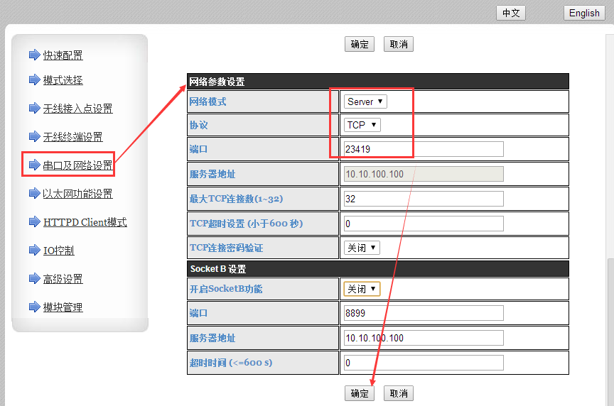 4:在串口及其他设置中,串口设置根据用户设备更改设置。在网络参数设置中,网络模式设置为TCP Server .端口号设置为23419。点击确认