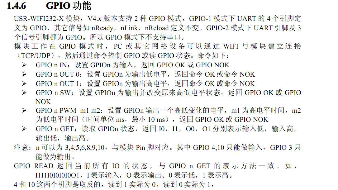 GPIO 4 ,10 只能做输入,GPIO 3只能做输出。 GPIO功能在AP模块下也可以使用,建立网络连接和socket连接,发送指令。可以控制GPIO。