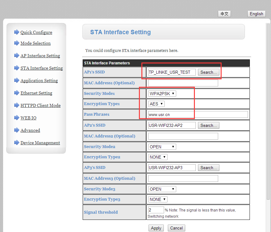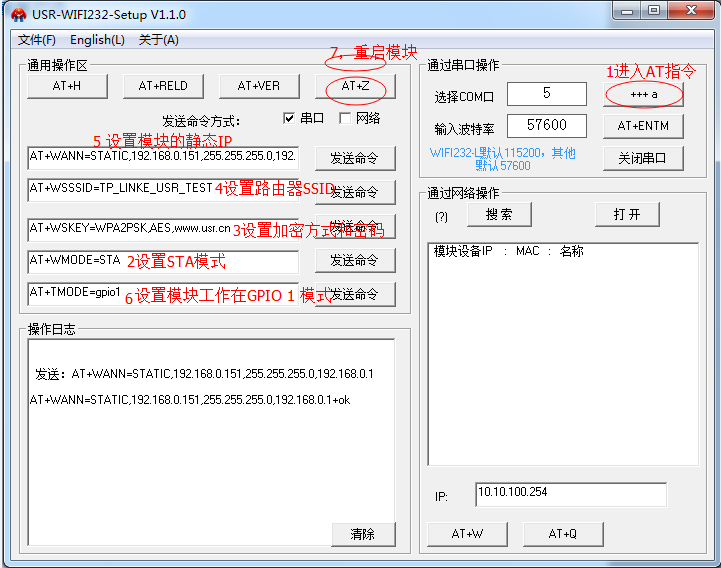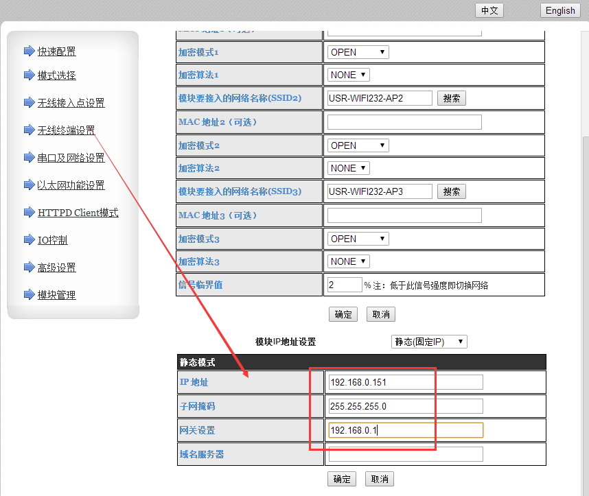 2:无线终端设置:设置模块连接的路由器SSID和密码。给模块设置一个静态IP。