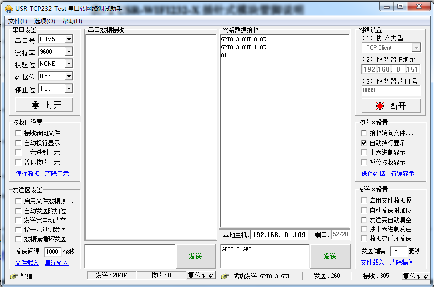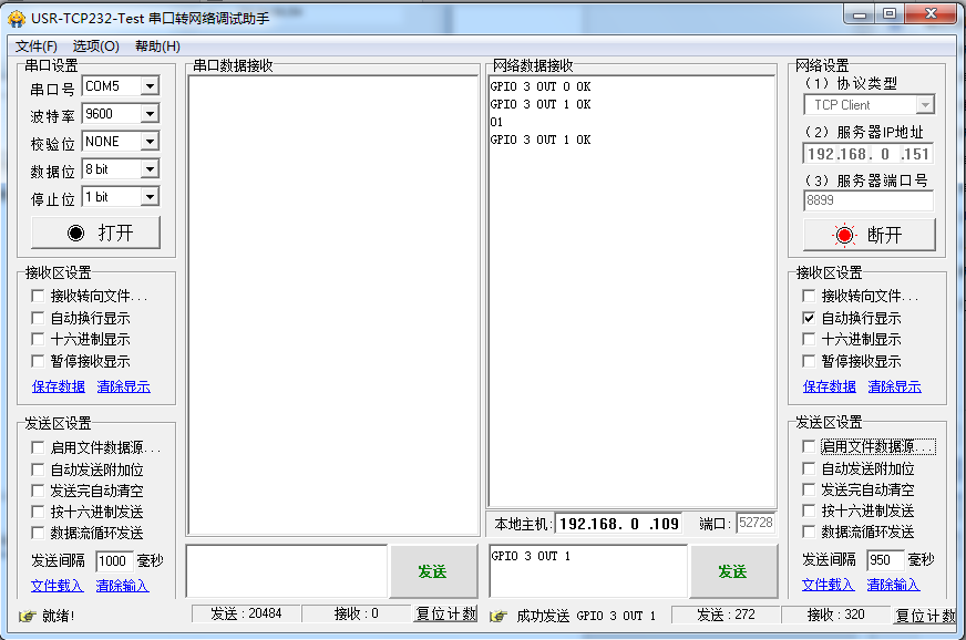 6:通过网络发送GPIO指令。 发送第3脚输出高电平。