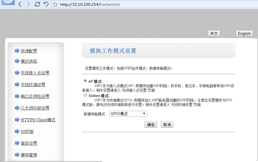 1:网页设置界面: station 模式,数据传输模式 GPIO模式.