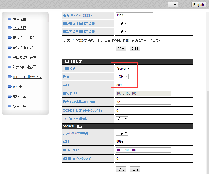 3:串口及其他设置设置: 网络模式为TCP Server。 端口8899.