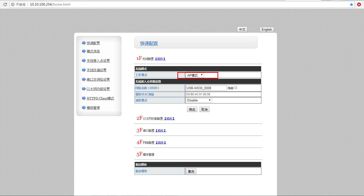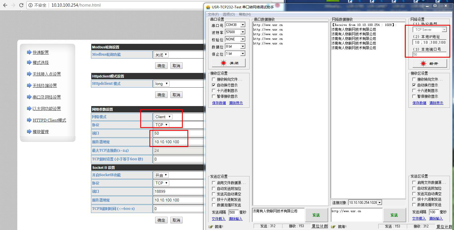 用USR-W610的IP 10.10.100.254 登录USR-W610的网页,然后修改W610的串口参数。测试4种工作模式下,串口和网络的数据透传。