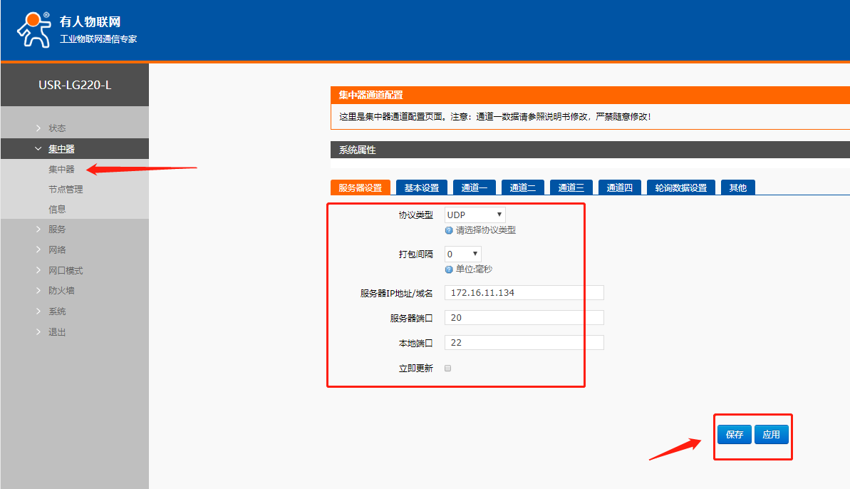 本文档使用的服务器主动下发模式,需LG220 V1.1.20以上版本固件才可设置。