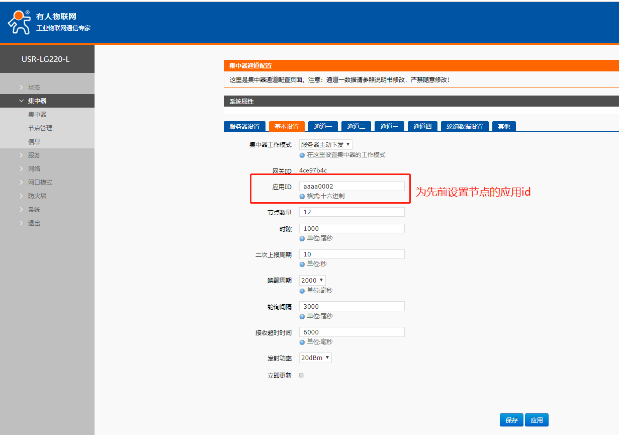 (4)设置集中器的应用ID,依次点击集中器,基本设置,应用ID,设置应用ID和lora相同。最后保存应用。
